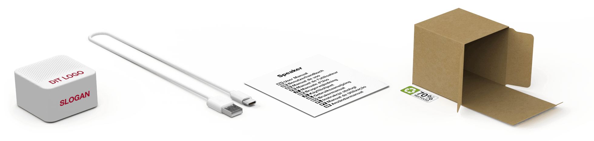 Bluetooth®-navnet er, hvad brugeren ser på sin smartphone eller tablet-enhed, når den parres med Audio produktet. Vi kan tilpasse dette navn til dit firmanavn, dette giver din organisation yderligere eksponering. Hvis du ikke ønsker denne løsning, vil standardnavnet 'Promo Audio' blive tildelt Audio produktet.Tilbehør