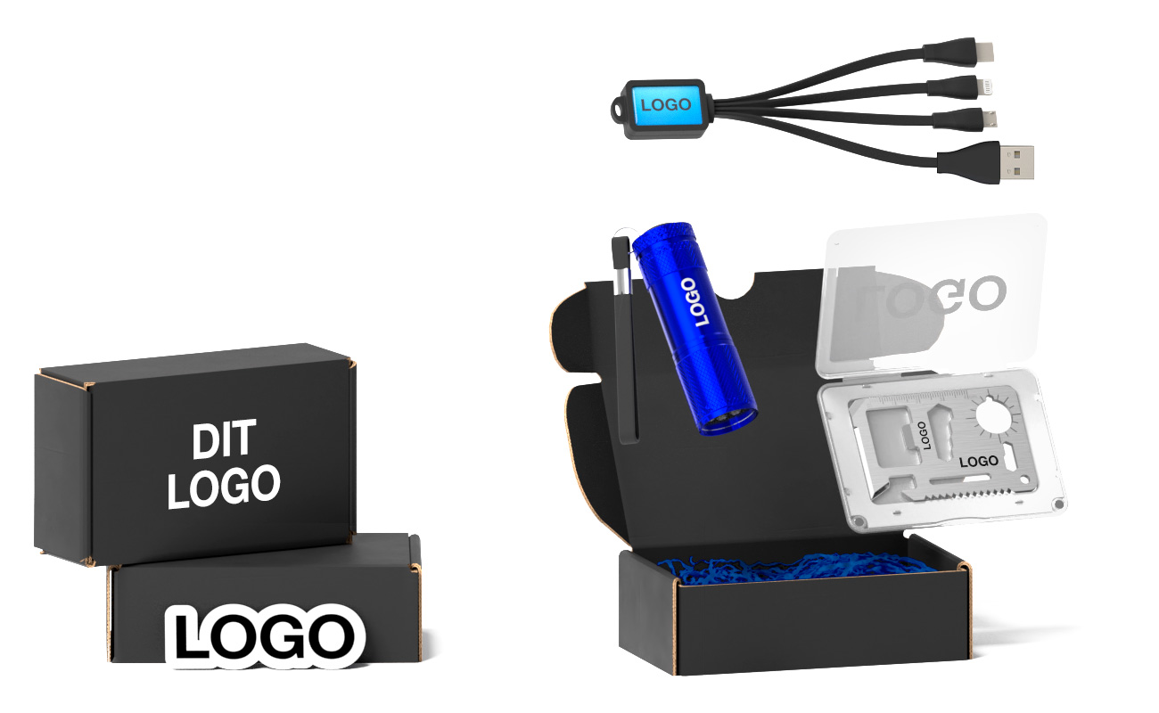 Gear er et praktisk gavesæt som indeholder et Multitool, lommelygte, og USB kabel som alle kan laves med dit logo. Låget på selve æsken har også et område dedikeret til dit logo.  Æsken kan også indeholde et mærke som kan trykkes med din grafik - helt uden merpris. Kontakt os i dag om priser, muligheder for  tryk, leveringstider og kombinationsmuligheder.