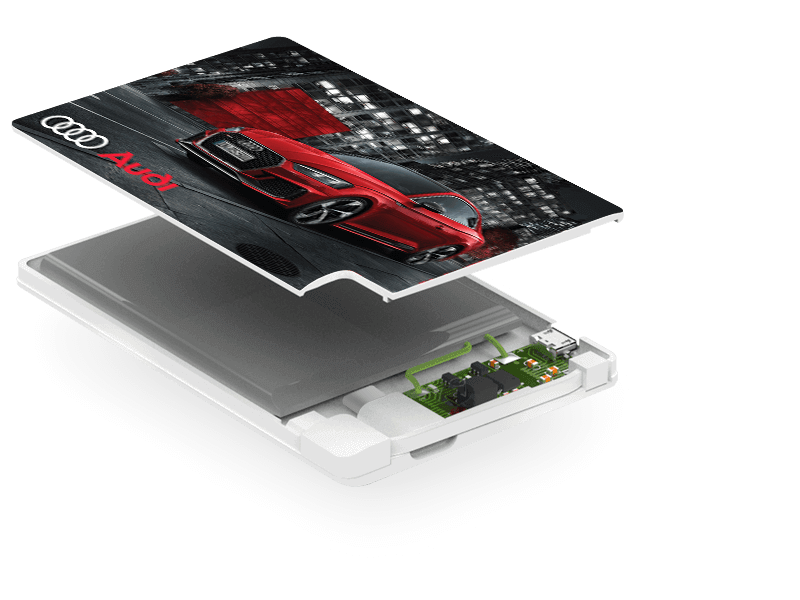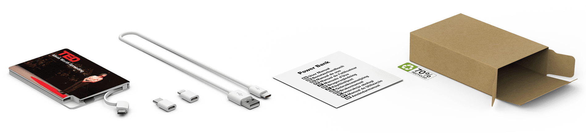 Card er en lille powerbank, med stor kraft. Det er den perfekte messegave eller medarbejdergave, der sikrer, at telefonens batteri forbliver fuldt opladet og klar til vigtige telefonopkald og møder. Med et fastgjort mikro-USB-kabel med både lightning- og USB-C-adaptere er enheden kompatibel med alle større mærker af mobile enheder, fra telefoner til tablets.