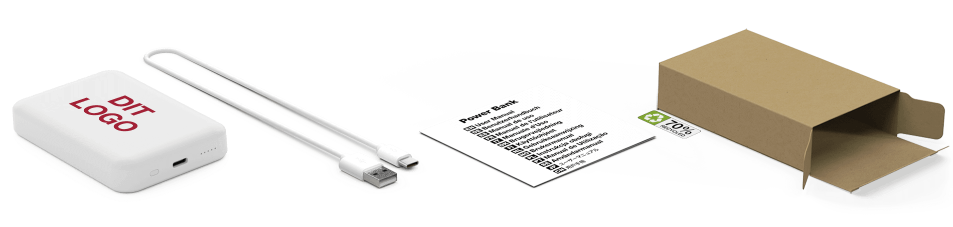 Force Powerbanken påsættes magnetisk og oplader trådløst MagSafe® kompatible telefoner. Den kan også fungere som en standard power bank, for telefoner som ikke er MagSafe® kompatible - hvilket gør den enormt populær og og anvendelig som reklameprodukt. Både for- og bagside af Force har dedikeret trykområde, klar til at fremvise dit brand i flot stil. Kontakt os i dag for tekniske spørgsmål, seneste priser, leveringstider eller muligheder for tryk.