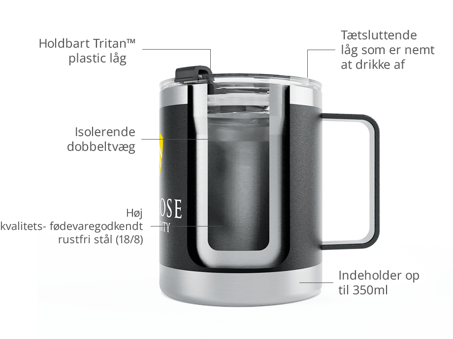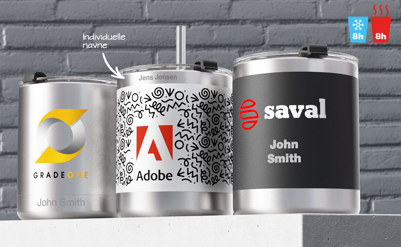 Graveringen skaber en uudslettelig mærkning af navn. Det er perfekt til sportsklubber og skoler, så man undgår potentiel forveksling af vandflasker eller rejsekopper under træning eller stævner. Hvert unikt navn vil ledsage dit logo og slogan på Drinkware-produktet.