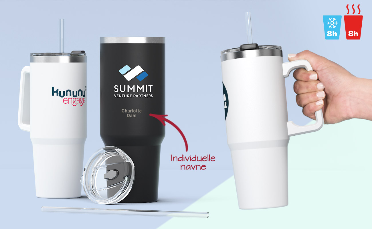 Graveringen skaber en uudslettelig mærkning af navn. Det er perfekt til sportsklubber og skoler, så man undgår potentiel forveksling af vandflasker eller rejsekopper under træning eller stævner. Hvert unikt navn vil ledsage dit logo og slogan på Drinkware-produktet.