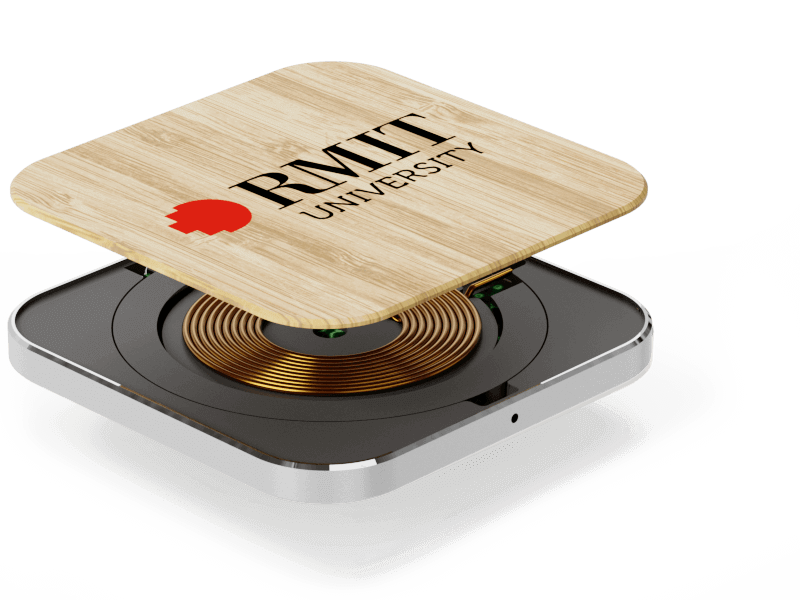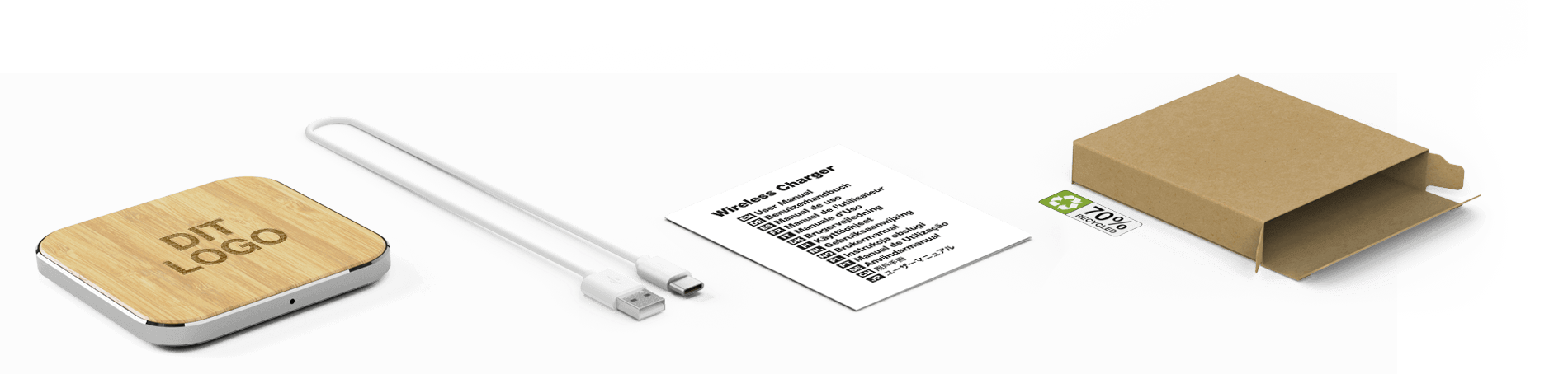 Opladeren har et USB-C-strømkabel for pålidelig tilslutning og er kompatibel med alle Qi-aktiverede enheder, herunder smartphones og tablets, hvilket sikrer, at dine kunder og medarbejdere har strøm hele dagen.