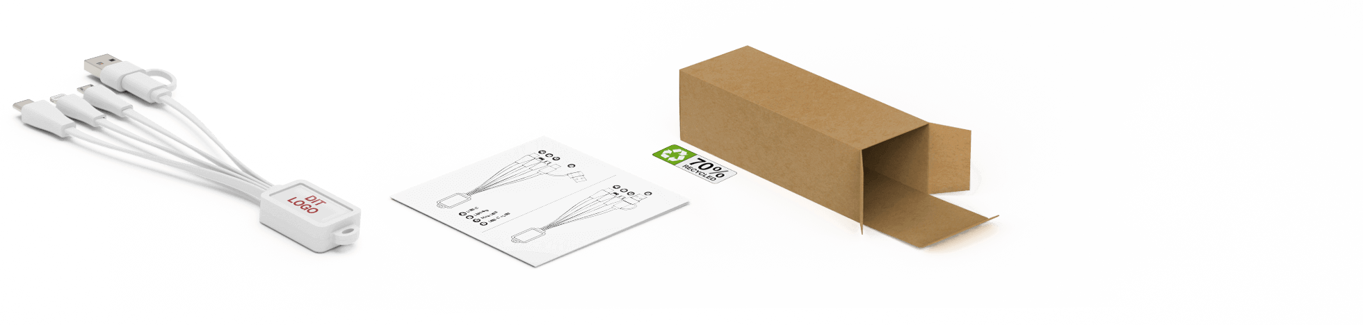 Multi kombinerer fire kabler i én pæn og praktisk model. Dine kunder kan tilslutte standard USB-stikket til en strømkilde og oplade op til tre enheder via lynadapteren, USB-C-stikket og micro USB-stikket. Multi kan fastgøres til nøgleringen og har et stort overfladeareal, som kan printes med foto, logo, hjemmeside og slogan. Hvis du vil have et strejf af narur, så tjek vores model.