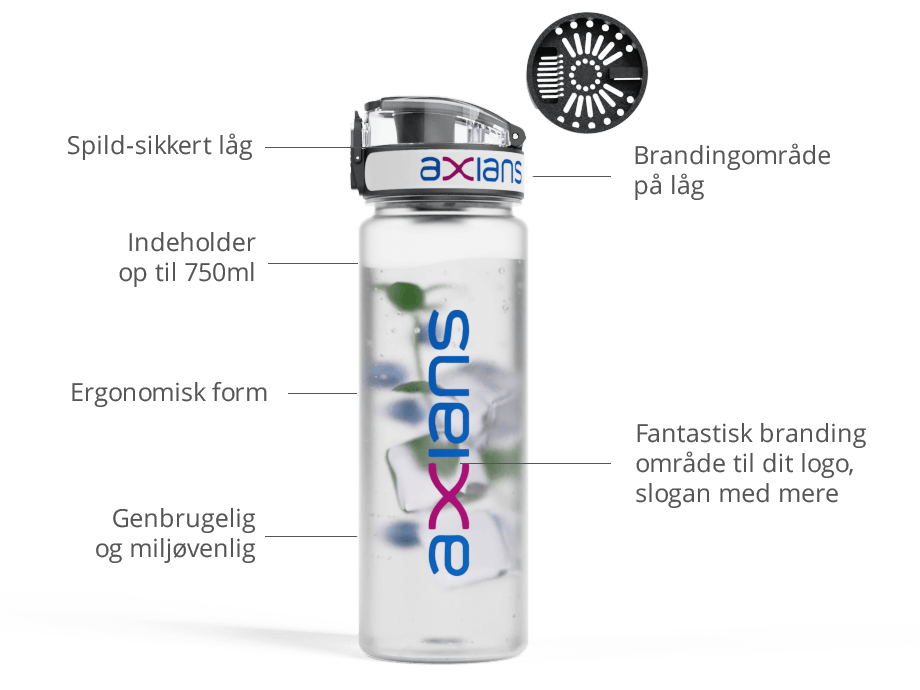 Aqualok Infuse er en fremragende tilføjelse til eksterne eller interne marketingkampagner, hvor det er vigtigt at fremme en sund livsstil og dit brand. Den kan tilpasses og skræddersys, så den matcher dit brands æstetik, lige fra flaskens farve til de illustrationer, der er trykt på den.