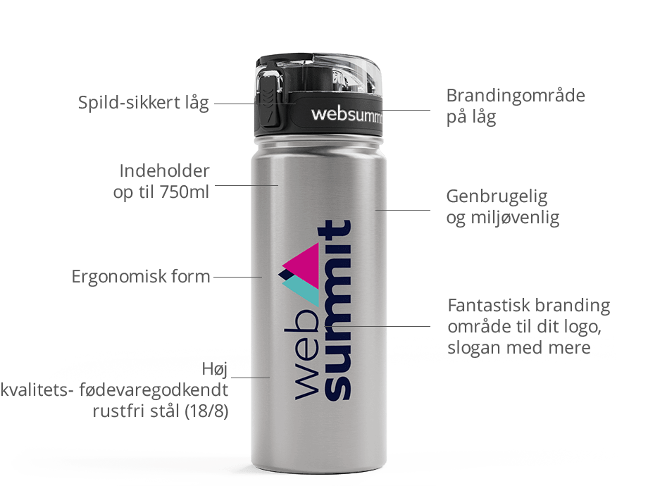 Graveringen skaber en uudslettelig mærkning af navn. Det er perfekt til sportsklubber og skoler, så man undgår potentiel forveksling af vandflasker eller rejsekopper under træning eller stævner. Hvert unikt navn vil ledsage dit logo og slogan på Drinkware-produktet.